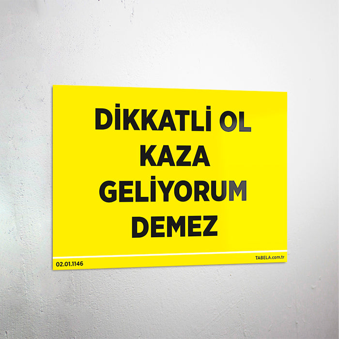 Dikkatli ol kaza geliyorum demez levhası, can ve mal kaybına neden olmaması için yaptığımız işlerde dikkatli olmamız ve önlem almamız gerektiğini, ansızın ortaya çıkacak kazaya karşı hazırlıklı olunması gerektiğini bildiren levha çeşitidir.